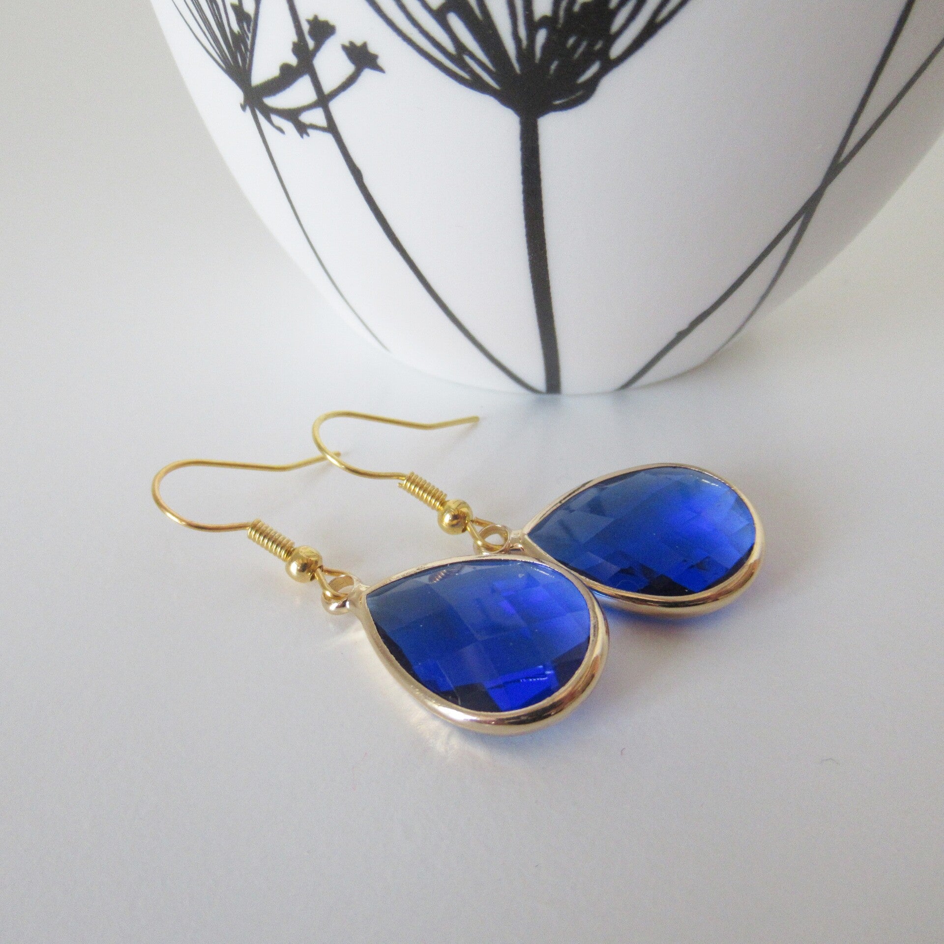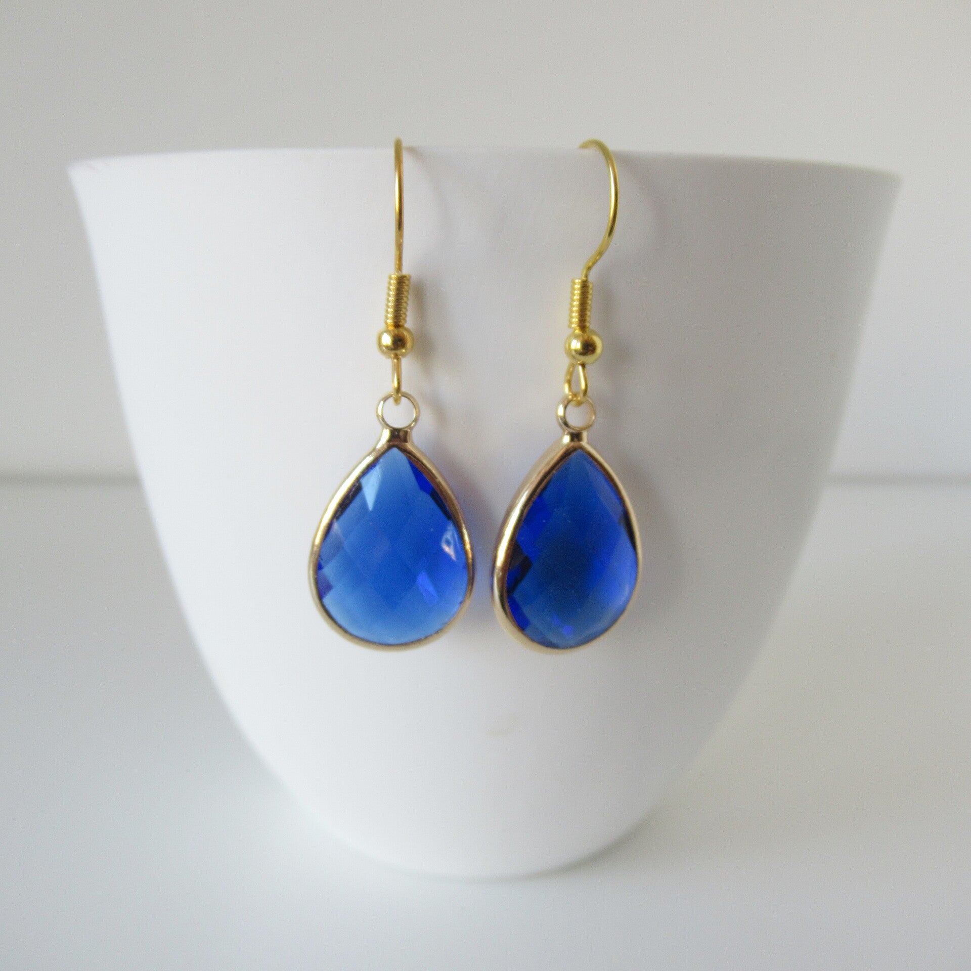 Goudkleurige blauwe druppel oorbellen.SpecificatieKleur: GoudMateriaal: Messing gold platedFormaat: 4 cmHandmadeNikkelvrij
